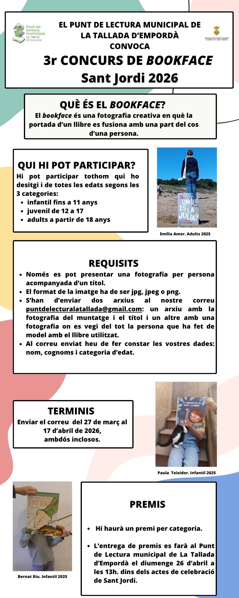 - S’han d’enviar dos arxius al correu puntdelecturalatallada@gmail.com : un arxiu amb la fotografia del muntatge i el títol i un altre amb una fotografia on es vegi del tot la persona que ha fet de model amb el llibre utilitzat