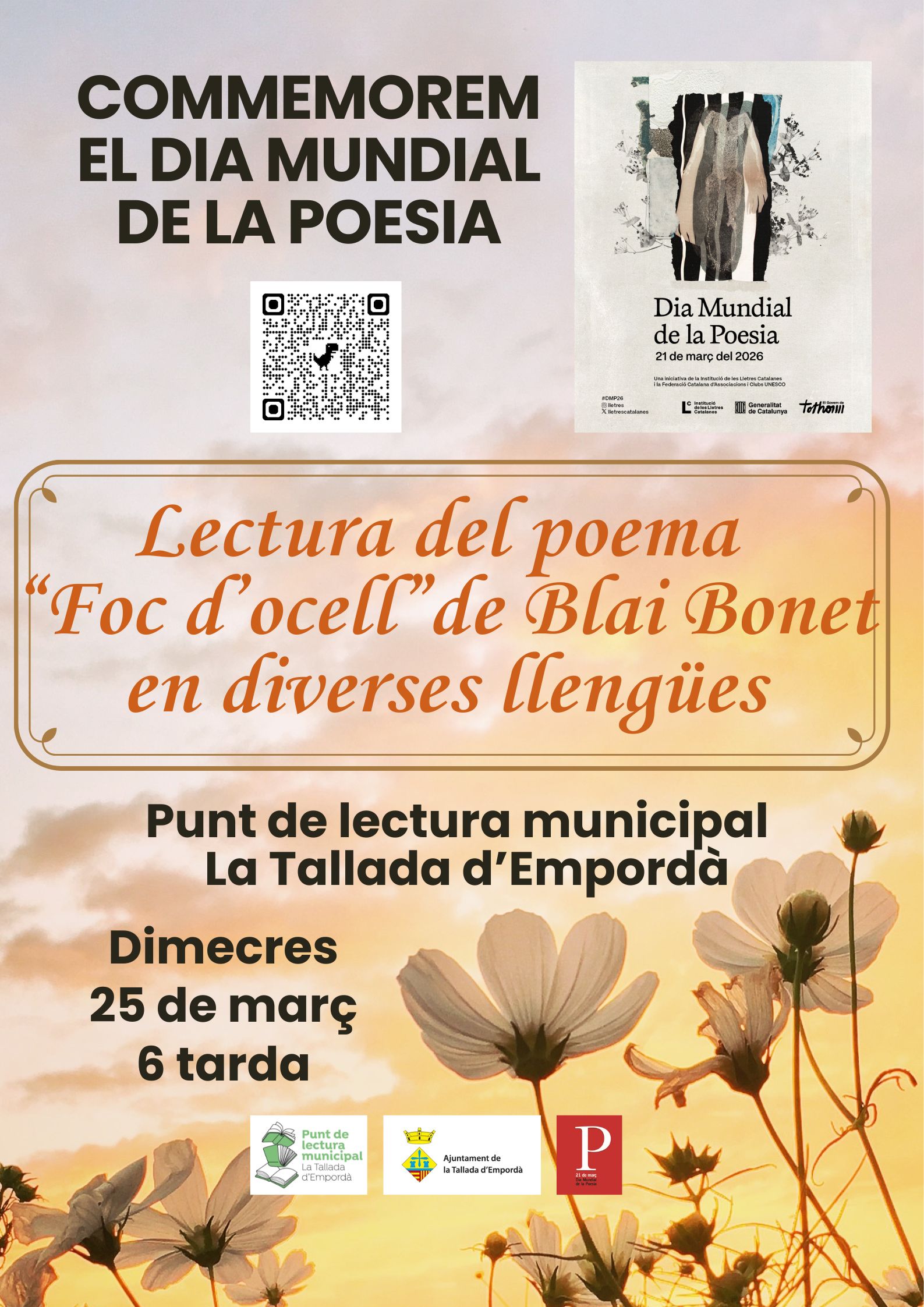 Lectura del poema “Foc d’ocell” de Blai Bonet en diverses llengües. Dimecres 25 de març a les 6 de la tarda Punt de lectura municipal