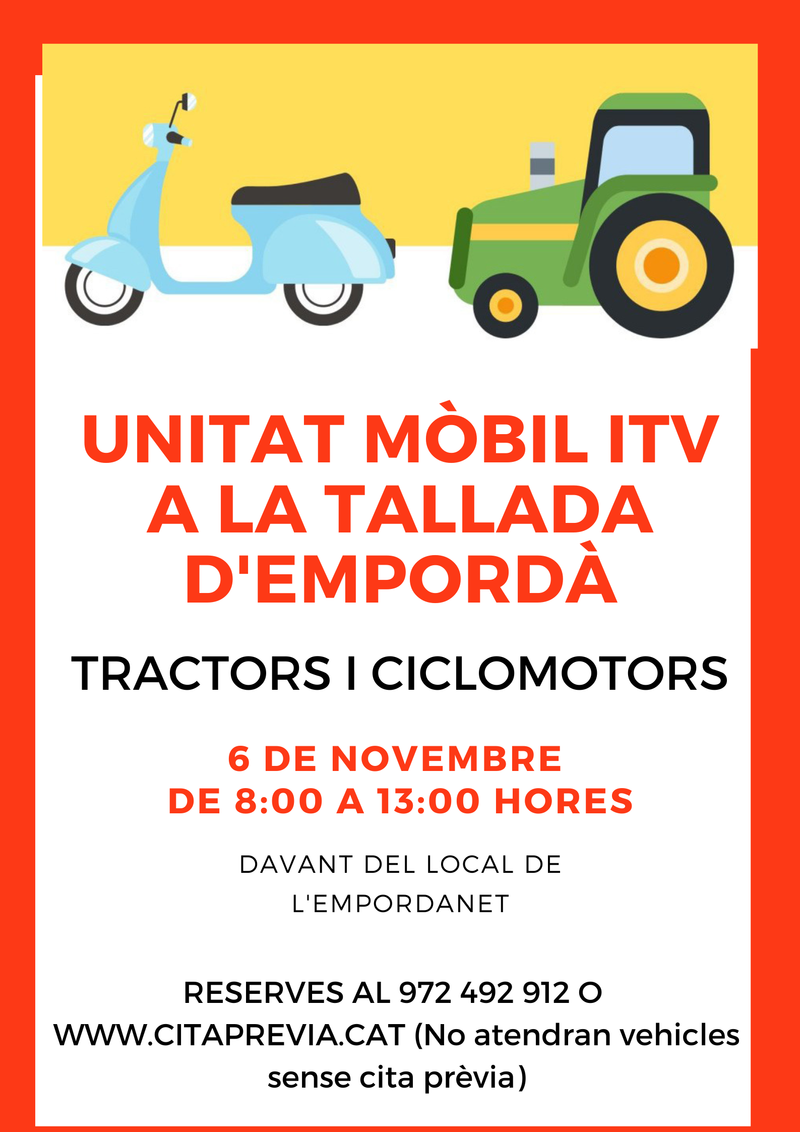 Calendari 2025 - 2026Una unitat mòbil d’ITV es desplaçarà a la Tallada d’Empordà el 6 de novembre per realitzar les inspeccions tècniques a ciclomotors i maquinària agrícola. Quins vehicles podran realitzar la inspecció? 🚜 Maquinària agrícola: remolcs i tractors 🛵 Ciclomotors de 49 cm³ 👉🏼 Cal reserva prèvia a través del telèfon 972 492 912 o www.citaprevia.cat