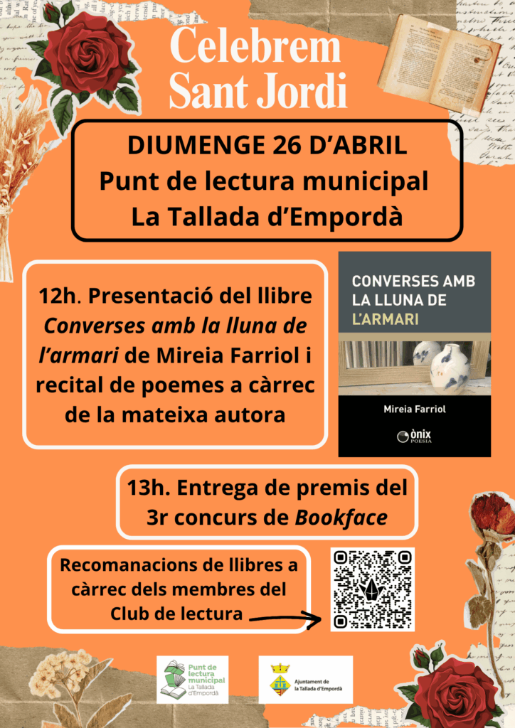 Agenda Celebrem Sant Jordi! Diumenge 26 d'abril de 2026 Celebrem Sant Jordi Diumenge 26 d’abril de 2026 12 hores – Presentació del llibre “Converses amb la lluna de l’armari” de Mireia Farriol i recital de poemes a càrrec de la mateixa autora 13 hores – Entrega de premis del 3r concurs de Bookface < Entrada Anterior