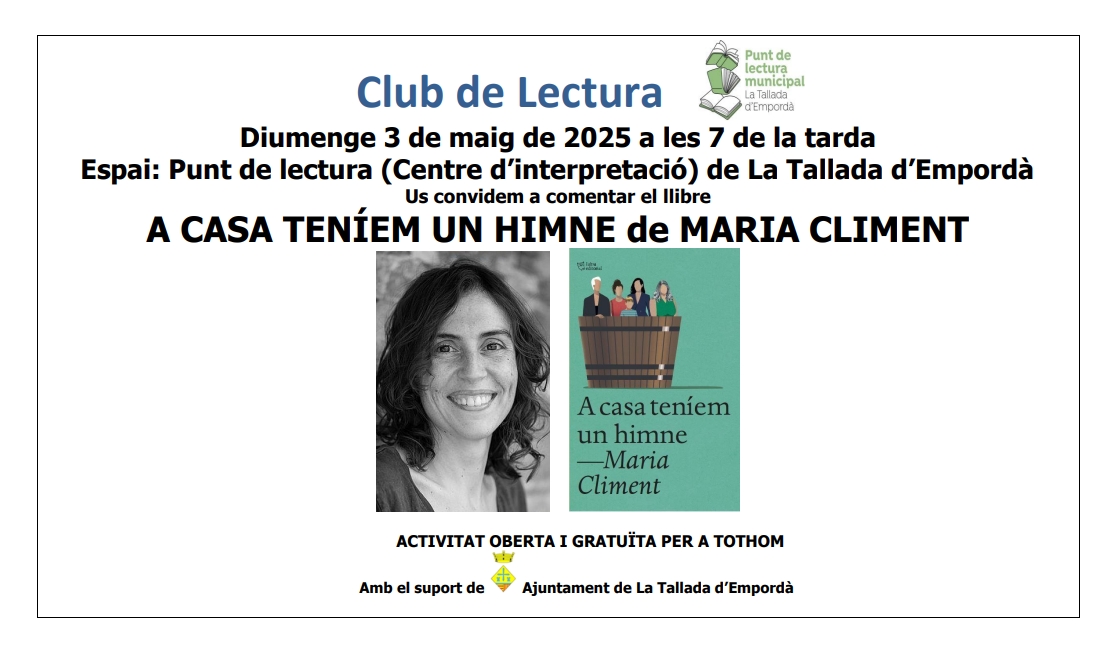 Agenda Club de lectura: “A casa teníem un himne” Diumenge 3 de maig de 2026 a les 7 de la tarda | Punt de lectura (Centre d'interpretació) Vine diumenge 3 de maig a les 7 de la tarda al Club de Lectura! Us convidem a comentar la novel·la: “A casa teníem un himne” de Maria Climent. Activitat oberta i gratuïta! < Entrada AnteriorEntrada Posterior >