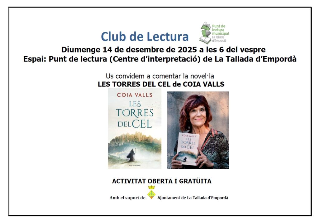 Agenda Club de lectura: “Les torres del cel” Diumenge 14 de desembre a les 6 del vespre | Punt de lectura (Centre d'interpretació) Vine diumenge 14 de desembre a les 6 del vespre al Club de Lectura! Us convidem a comentar la novel·la: “Les torres del cel” de Coia Valls. Activitat oberta i gratuïta! < Entrada Anterior