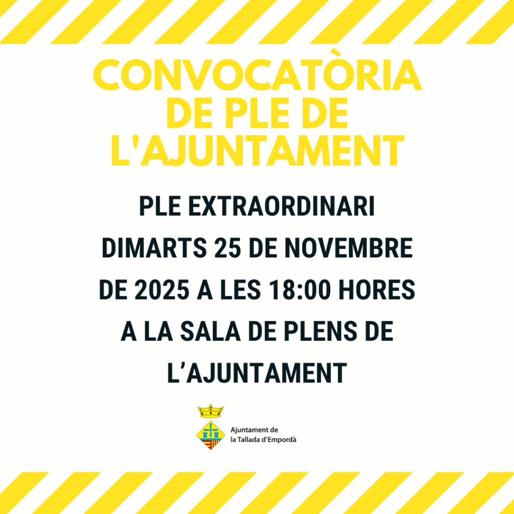 S’ha convocat sessió extraordinària urgent del Ple de la corporació, i que es celebrarà a la Sala de Plens de l’ajuntament el proper dimarts dia 25 DE NOVEMBRE DE 2025 A LES 18:00 HORES.