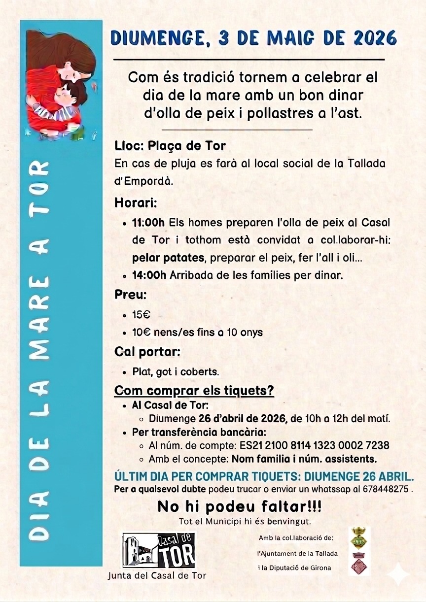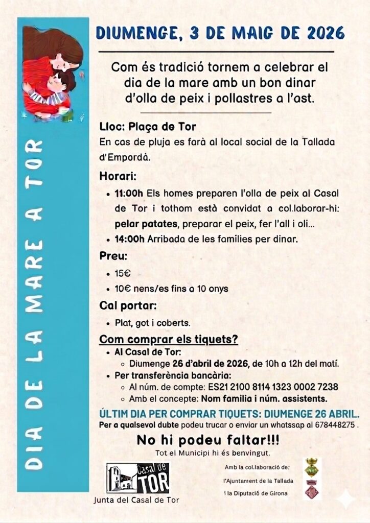 Agenda Dia de la Mare a Tor Diumenge 3 de maig de 2026 Com és tradició tornem a celebrar el dia de la mare amb un bon dinar d’olla de peix i pollastres a l’ast. Diumenge, 3 de maig de 2026 No hi podeu faltar!! < Entrada Anterior