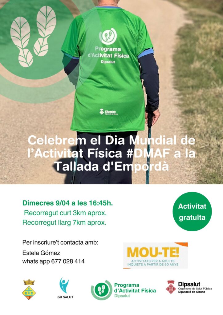 Agenda Dia Mundial de l’Activitat Física Dimecres 9 d'abril a les 16.45 hores Celebrem el Dia Mundial de l’Activitat Física #DMAF a la Tallada d’Empordà. Recorregut curt 3 km aprox. Recorregut llarg 7 km aprox. Per inscriure’t contacta amb: Estela Gómez – WhatsApp 677 028 414 Activitat gratuïta! < Entrada AnteriorEntrada Posterior >