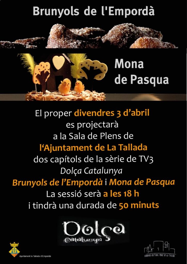 Divendres 3 d’abril es projectarà a la Sala de Plens de l’Ajuntament de La Tallada dos capítols de la sèrie de TV3 “Dolça Catalunya” – Brunyols de l’Empordà i Mona de Pasqua.